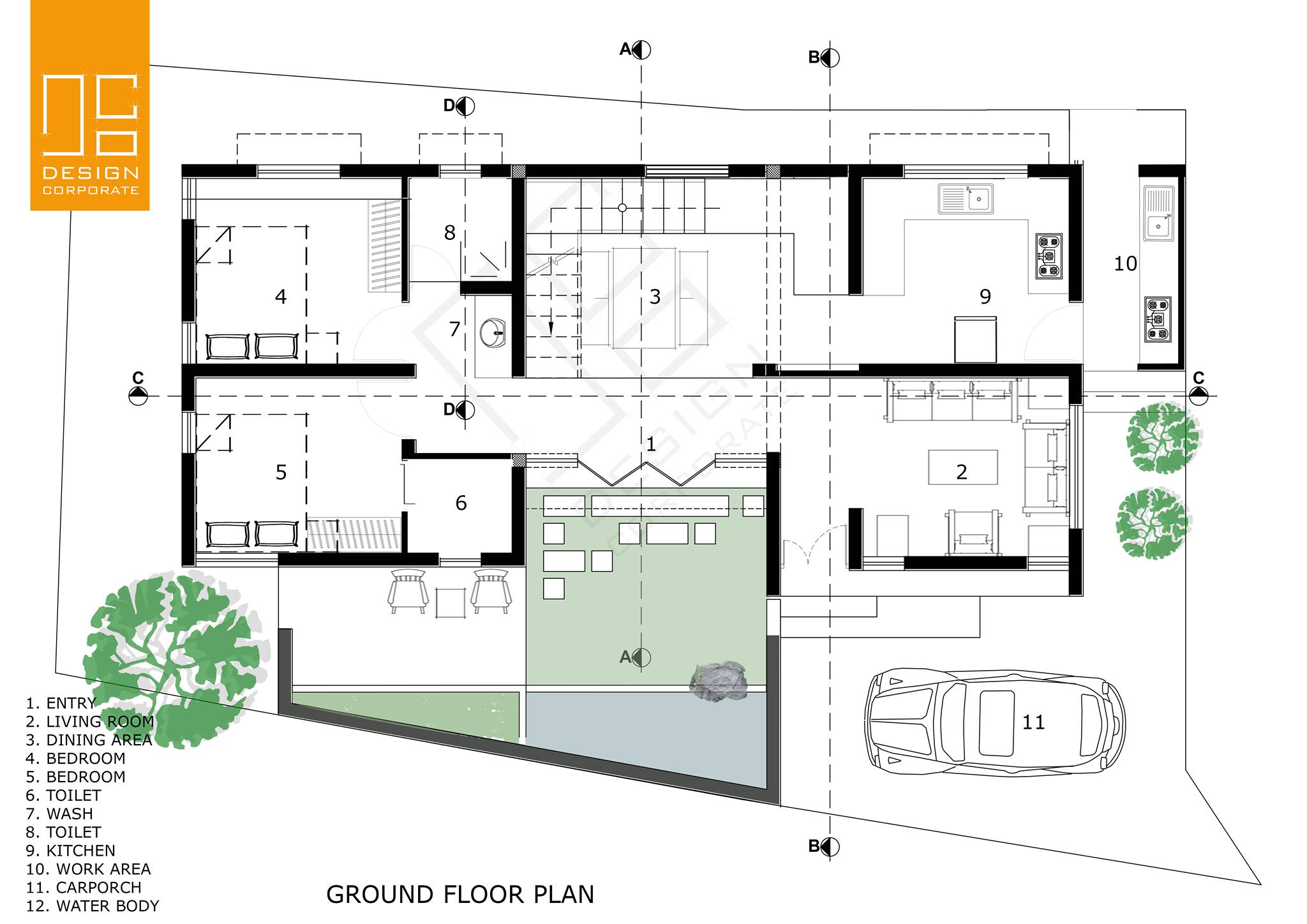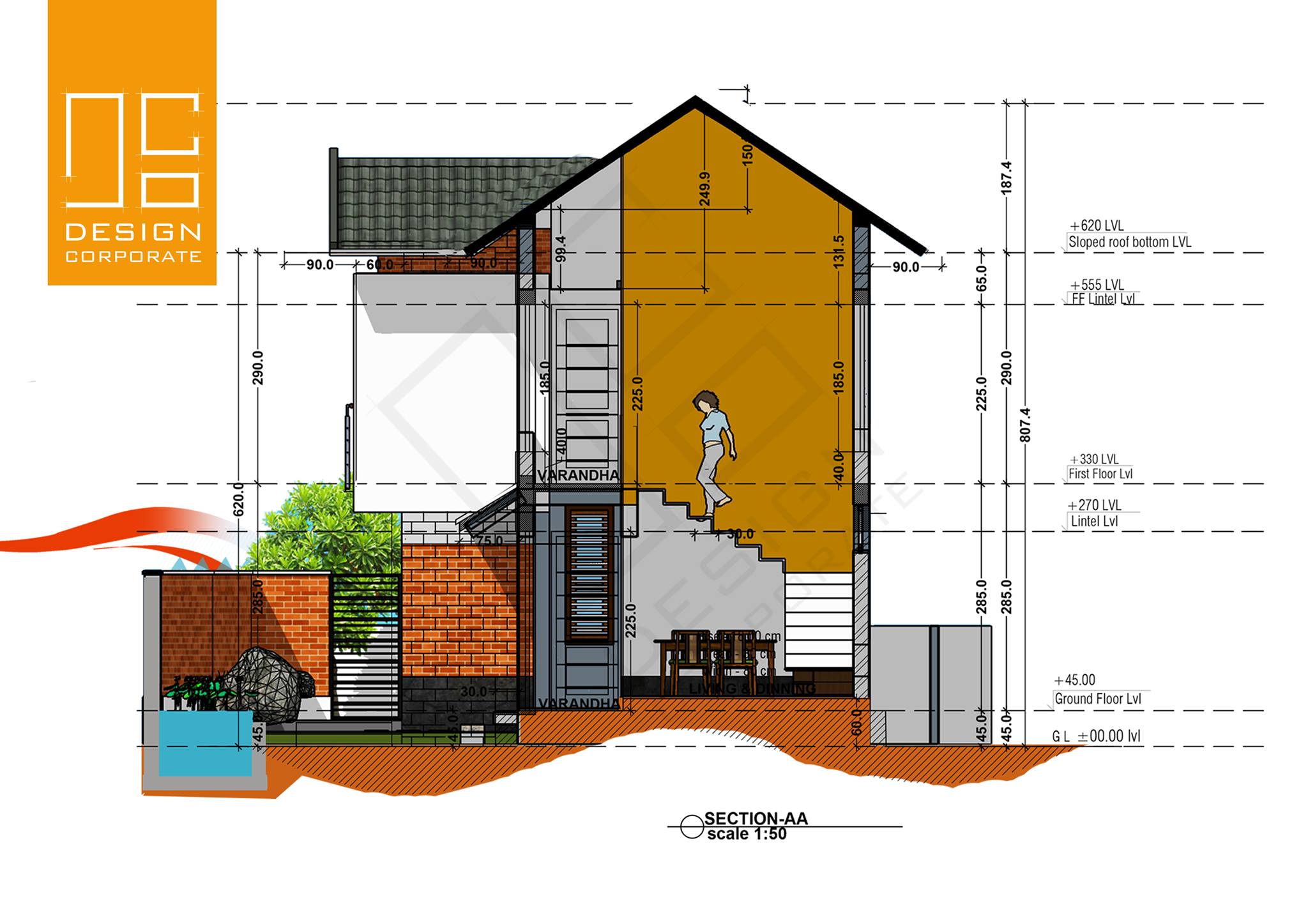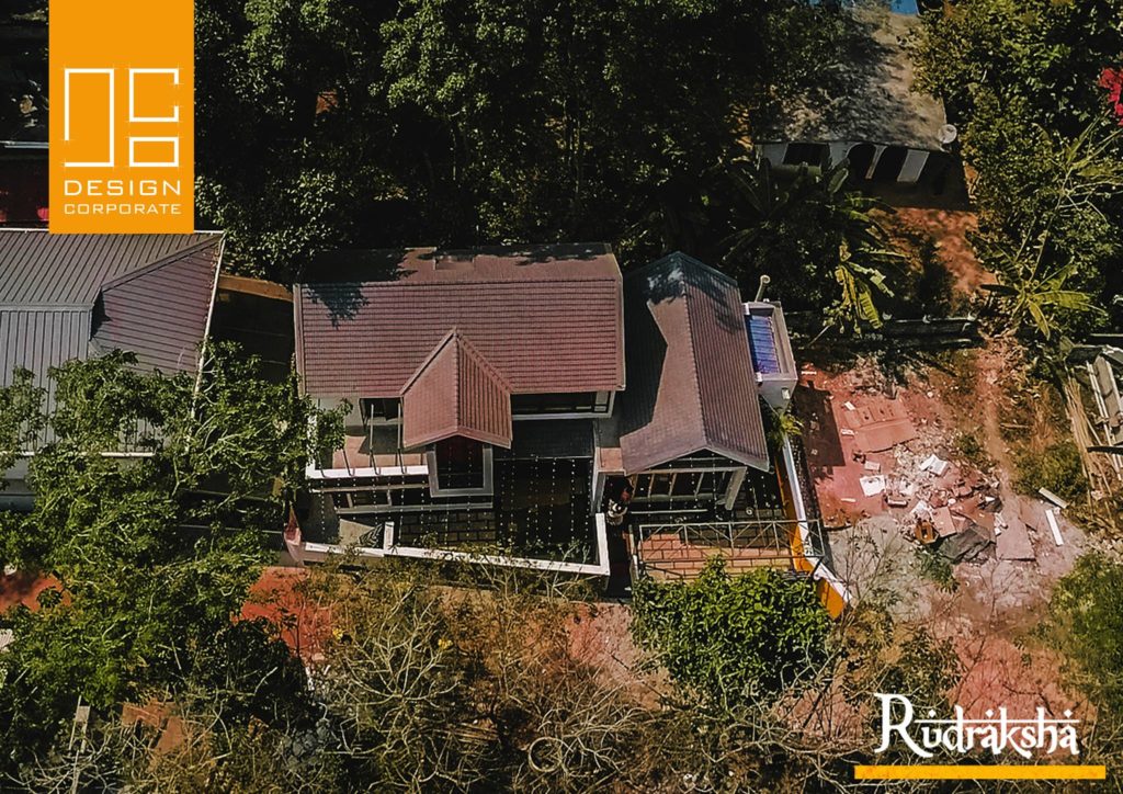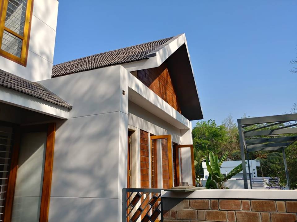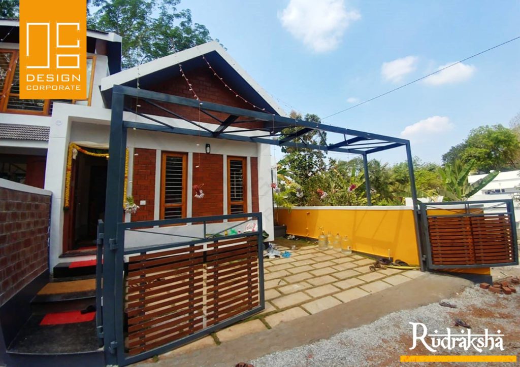 Rudraksha is a house built for Mr. Vishnu Chandran who is a U I/ UX Designer , his wife, his son, parents and grandparents. The challenge was to design a three bedroom house in a narrow rectangular plot of 4 cents which faces 3m road. The design is done in such a way that the land topography, which is linear and narrow, would not affect the aesthetics or functionality of the residence and it fulfils the client requirements to 100. Care was taken to make the house look more spacious. The planning is done in a modern pattern and the exposed brick finish on the exterior and the sloping roof gave a traditional touch and thus the house is a blend of tradition and modernism! Rat trap bond construction method used helped save cost, and helped the residence be Eco friendly. The same pattern of movement of their previous home was demanded by the client and it is achieved as well in this tropical modern house.